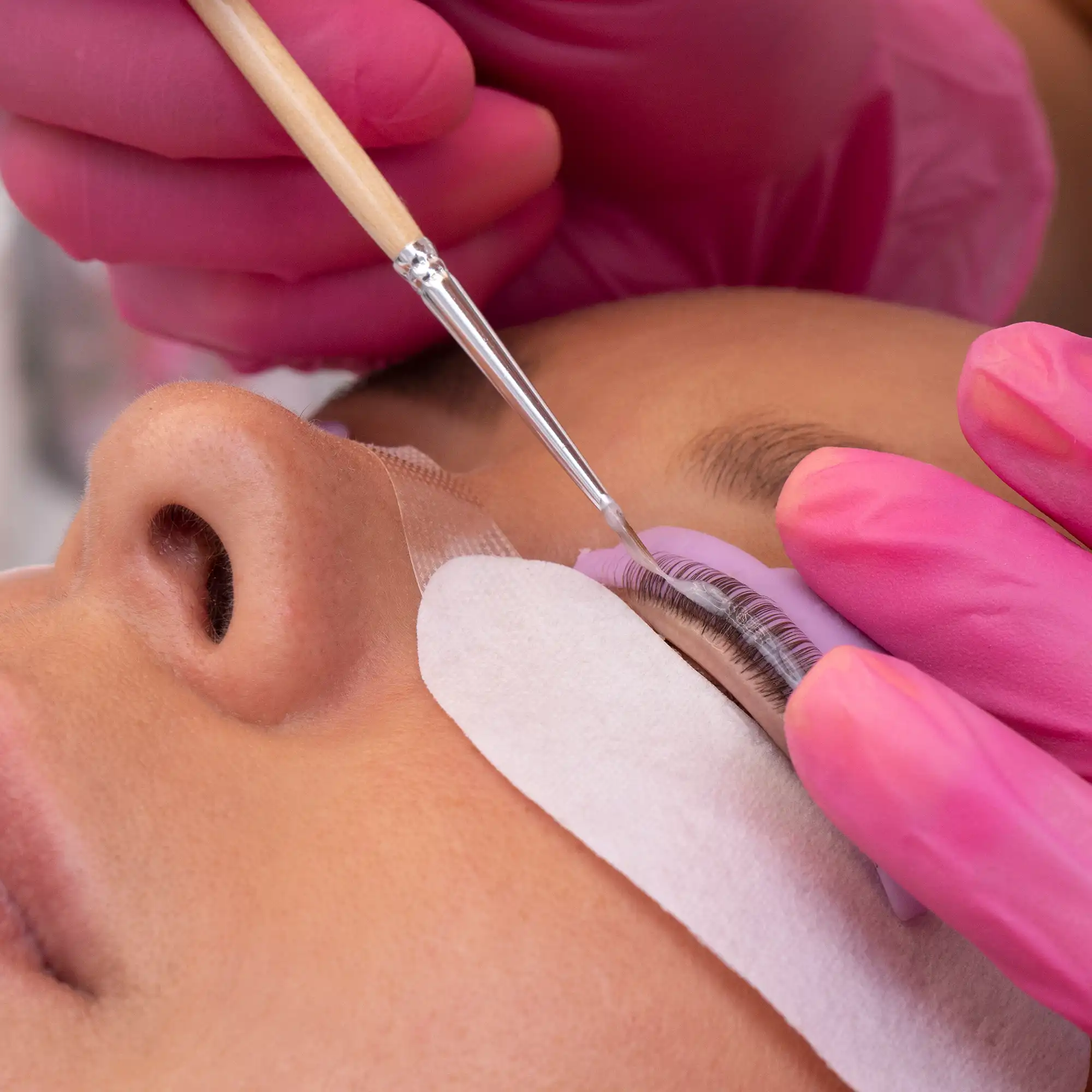 Lifting Solution Application: A special lifting solution is applied to the lashes, breaking down the natural structure of the lashes.